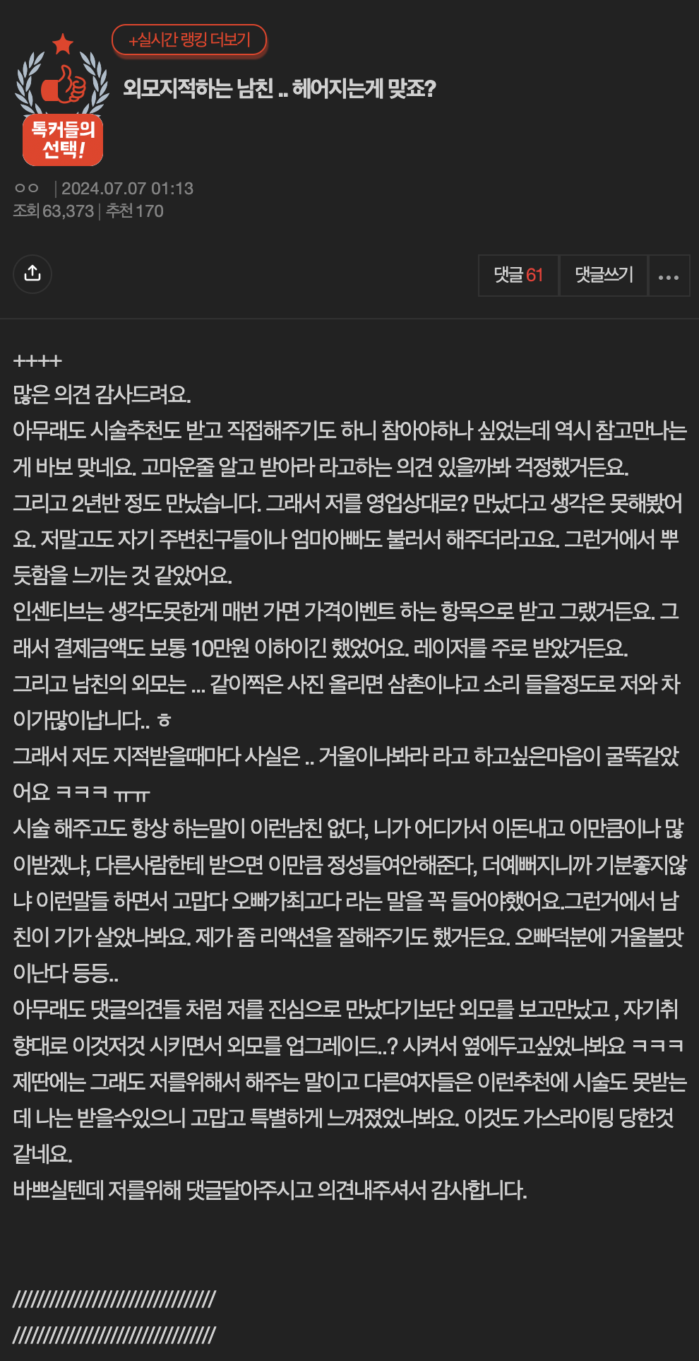 외모지적하는 남친 .. 헤어지는게 맞죠?