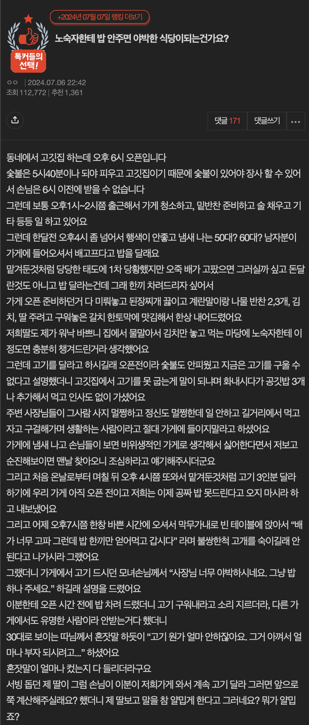 노숙자한테 밥 안주면 야박한 식당이되는건가요?